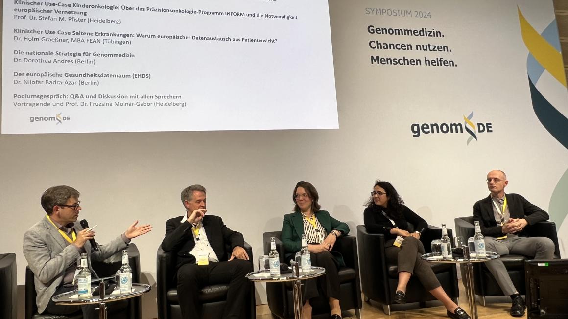 Auf der letzten Podiumsdiskussion des Symposiums diskutierten neben Dr. Stefanie Houwaart als Patientenvertreterin, Dr. Johanna Tecklenburg (Bioscientia Institut für Medizinische Diagnostik GmbH), Prof. Dr. Wolfram Henn (Institut für Humangenetik der Universität des Saarlandes), Dr. Gerhard Schillinger (AOK-Bundesverband) zusammen mit Dr. Johannes Bruns (Deutsche Krebsgesellschaft e. V.) und Matthias Mieves, MdB, (Sprecher für e-health der SPD-Fraktion, Mitglied im Gesundheitsausschuss und im Ausschuss für Digitales im Deutschen Bundestag) darüber, was es für eine erfolgreiche Umsetzung von Genommedizin braucht und wie qualitätsgesicherte Versorgung in die Zukunft getragen werden kann.