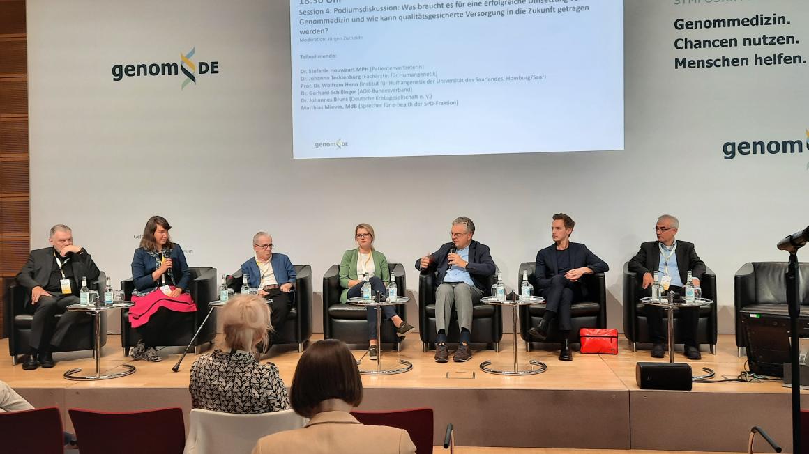 Auf der letzten Podiumsdiskussion des Symposiums diskutierten neben Dr. Stefanie Houwaart als Patientenvertreterin, Dr. Johanna Tecklenburg (Bioscientia Institut für Medizinische Diagnostik GmbH), Prof. Dr. Wolfram Henn (Institut für Humangenetik der Universität des Saarlandes), Dr. Gerhard Schillinger (AOK-Bundesverband) zusammen mit Dr. Johannes Bruns (Deutsche Krebsgesellschaft e. V.) und Matthias Mieves, MdB, (Sprecher für e-health der SPD-Fraktion, Mitglied im Gesundheitsausschuss und im Ausschuss für Digitales im Deutschen Bundestag) darüber, was es für eine erfolgreiche Umsetzung von Genommedizin braucht und wie qualitätsgesicherte Versorgung in die Zukunft getragen werden kann.